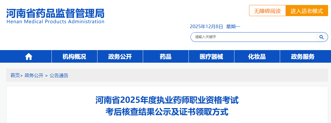 河南省药品监督管理局于2025年11月22日至12月5日对全省2025年度执业药师职业资格考试成绩合格人员进行了考后资格核查,现将考后资格核查结果及合格人员资格证书领取方式告知如下: