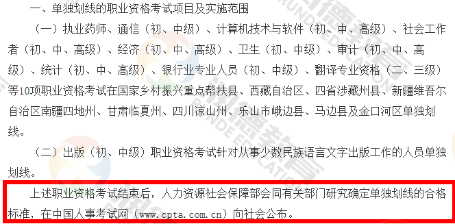 上述职业资格考试结束后,人力资源社会保障部会同有关部门研究确定单独划线的合格标准,在中国人事考试网(www.cpta.com.cn)向社会公布。