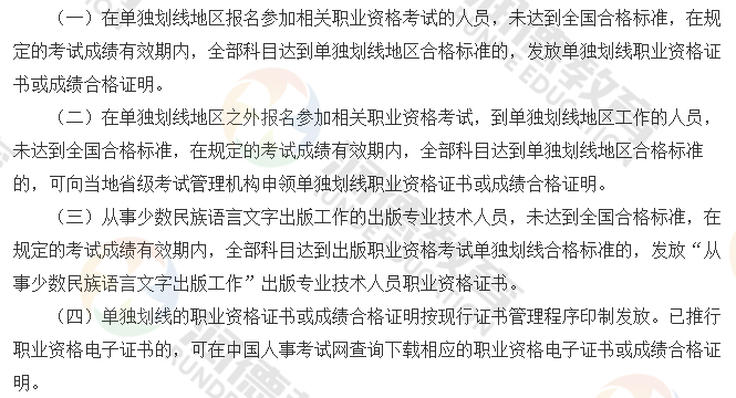 在单独划线地区报名参加相关职业资格考试的人员,未达到全国合格标准,在规定的考试成绩有效期内,全部科目达到单独划线地区合格标准的,发放单独划线职业资格证书或成绩合格证明。