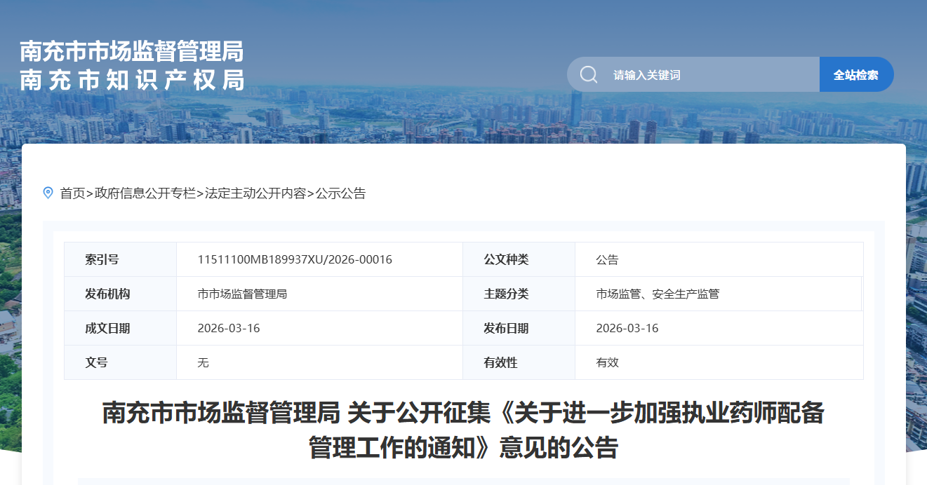 上个月,四川南充市市场监督管理局也发布关于公开征集《关于进一步加强执业药师配备管理工作的通知》意见的公告,其中明确:更明确规定医院也要配置执业药师!